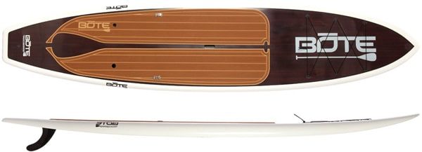 La planche BOTE Board est la plus connue et surtout la plus emblématique de la marque, reconnaissable entre toutes pas son aspect bois traditionnel. Elle est conçue pour être la plus polyvalente possible avec une grande maniabilité, une bonne vitesse de croisière et une très bonne stabilité, sans oublier les accessoires. Eh oui, vous avez à dispo, des portes cannes, un porte gobelet, des clips à aubes, une glacière, un dossier, etc. Sa conception est en mousse EPS à haute densité, recouvert de fibre de verre époxy et de peinture à bateau pour protéger et embellir. Le pads est vraiment très sympa et très classe avec cette imitation cuire et sa découpe caractéristique en forme de rame.