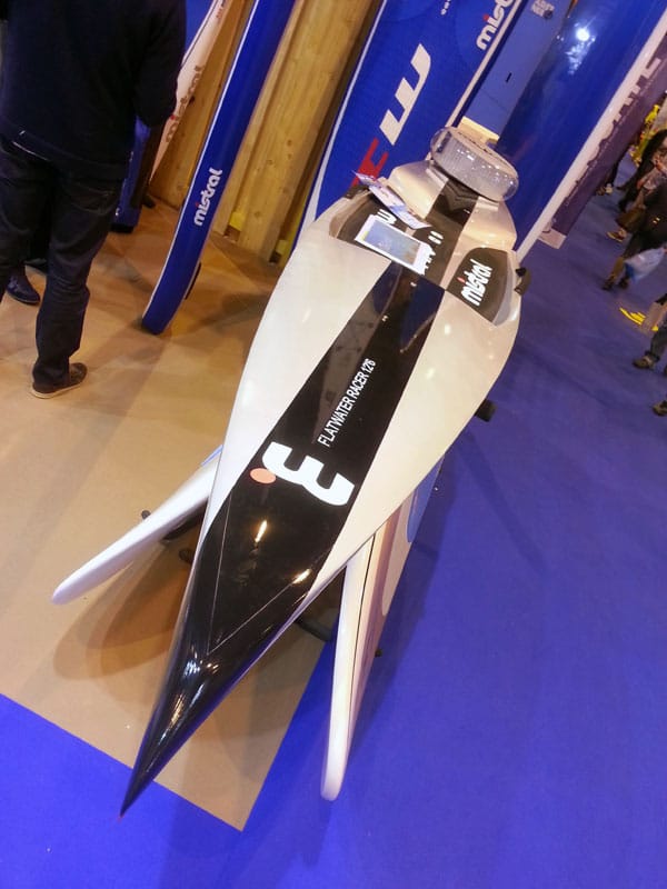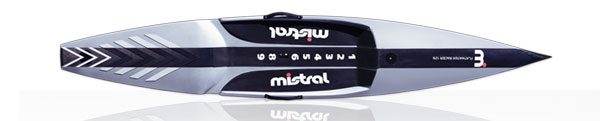 La Mistral M2 Flatwater est un stand up paddle de course en carbone ultra léger, avec un poids de 8.6kg pour la 12’6 et 9.3kg pour la 14’0. Conçu pour un plan d’eau plat, elle est taillée à 100% pour la vitesse et ça se voit par la forme conique de la coque, idéale pour l’accélération et la glisse. Son point fort et sa faiblesse, sa largeur exceptionnellement étroite qui est top pour le plat mais qui, comme on a pu le voir au Nautic Sup Paddle, la rend très instable dès le moindre clapot. On remarquera aussi sur les photos, ce nose “Hawk” avec un pseudo “aileron”, qui offre une meilleure stabilité directionnelle, ce qui signifie que vous devez changer de côté de rame moins fréquemment pour aller droit.