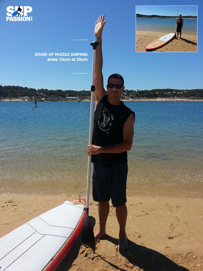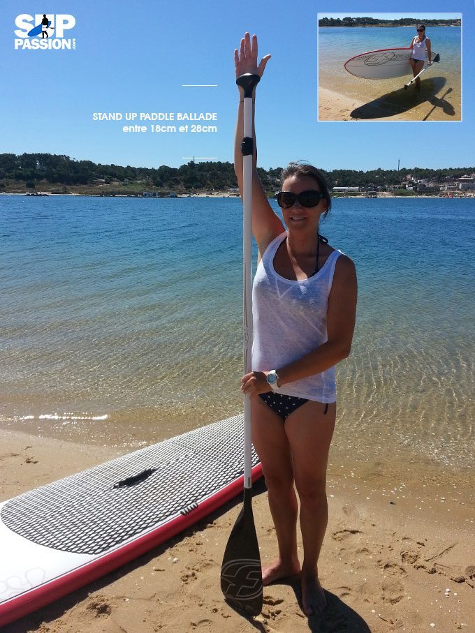 En balade avec un sup et pour commencer ses premiers coups de rame, le plus simple est de régler la hauteur de sa pagaie avec le bras levé, au niveau de son poignet. Cela fait approximativement entre 18cm et 28cm de plus que votre taille.