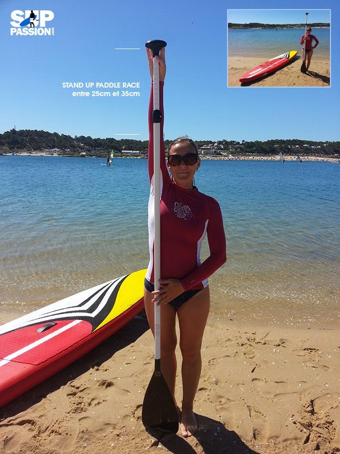 Enfin, les planches de stand up paddle race sont plus épaisses que les autres. C’est pourquoi la pagaie doit être réglée entre 25cm et 35cm de plus que votre taille, voir plus en fonction de la planche.