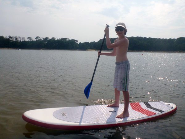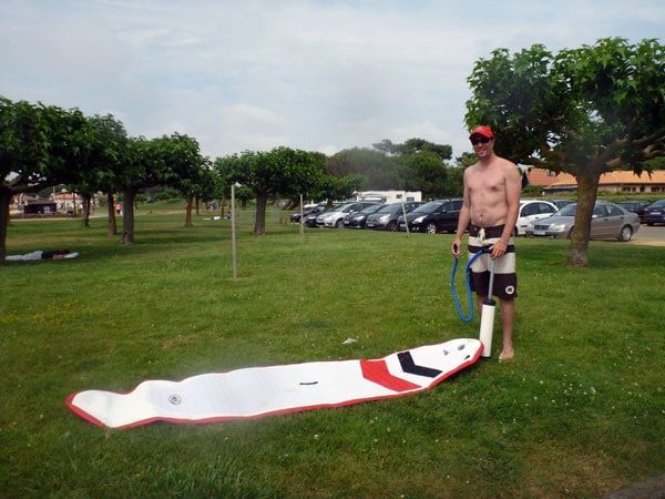 Le premier test s’est fait sur l’étant de Biscarosse sous un beau soleil et une brise on shore. Je l’ai gonflé en 2,5mn ! On est tout de suite surpris quand on est pas habitué à avoir une planche gonflable par le côté souple de la planche. Ensuite ce qui étonne c’est la flottabilité de la planche, on est quand même relativement haut. Au niveau de la vitesse c’est étonnant aussi à ce niveau là. Pour info je pèse 75kg pour 1.80m, mon fils de 12 ans l’a essayé et adopté, et pour finir, un ami en avait jamais fait et il est tout de suite devenu accro sans tomber.