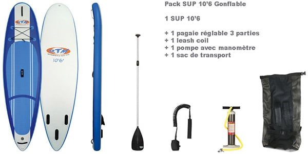 Ces stand up paddle gonflables RTM sont vendus en pack avec 1 sac à dos de transport, 1 pompe à main avec manomètre, 1 leash coil 10’, 1 kit de réparation, et 1 pagaie démontable (3 parties). Elles disposent de deux ailerons latéraux de 4.5’ et d’un aileron central amovible de 6.75’. Le sup 10’6 (3.20m) gonflable RTM à un volume de 210 litres, une largeur de 34′ (86,3cm), une épaisseur de 6′ (15cm) pour un poids de 14kg et une capacité max d’un poids de 100kg. Après test, il en résulte que pour une planche de stand up paddle gonflable, elle est dynamique, facile, évolutive avec une bonne glisse. Elle est aussi très pratique à transporter avec sa poignée. Sa rigidité doit rendre cette board relativement agréable en surf, mais au niveau de la prise de quart, il ne faudra pas attendre le résultat d’une rigide. On pourra juste regretter le fait de ne pas avoir trois ailerons amovibles.
