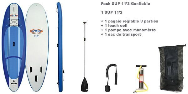 Pour ce qui est de la 11’2, ce stand up paddle gonflable a un volume de 405 litres, une largeur de 39′ (99cm), une épaisseur de 6′ (15cm) pour un poids de 19kg et une capacité max d’un poids de 130kg. Le gros avantage et qu’on peut se mettre à deux dessus, la preuve en image. Et sa largeur en fait une planche très stable et idéale pour se balader en famille ou pour apprendre le stand up paddle.