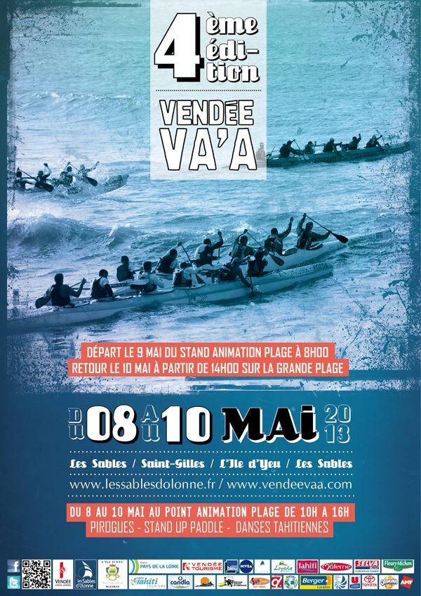 La Vendée Va’a, une course de pirogue qui aura lieu du 8 au 10 mai 2013 avec 17 équipes qui s’affronteront sur les 110 km de la course.Voici un évènement à ne pas louper, une course de pirogue en haute mer reliant les Sables d’Olonne à Saint-Giles-Croix de Vie et l’Île d’Yeu. Ce sera la quatrième édition et on vous en parle puisqu’il y aura aussi des animations stand up paddle parralèlement à la course et à l’ensemble de la manifestation, le 9 et 10 mai de 10h à 16h sur la plage des Sables d’Olonne. Comme toute bonne manifestation, il y a aura également une course Beach race Elite 12’6 jeudi 9 mai à 8h. La Vendée Va’a est l’une des compétitions les plus difficiles au monde et unique en Europe, de re-nommée internationale mettant en avant la culture polynésienne à travers la pratique du va’a.